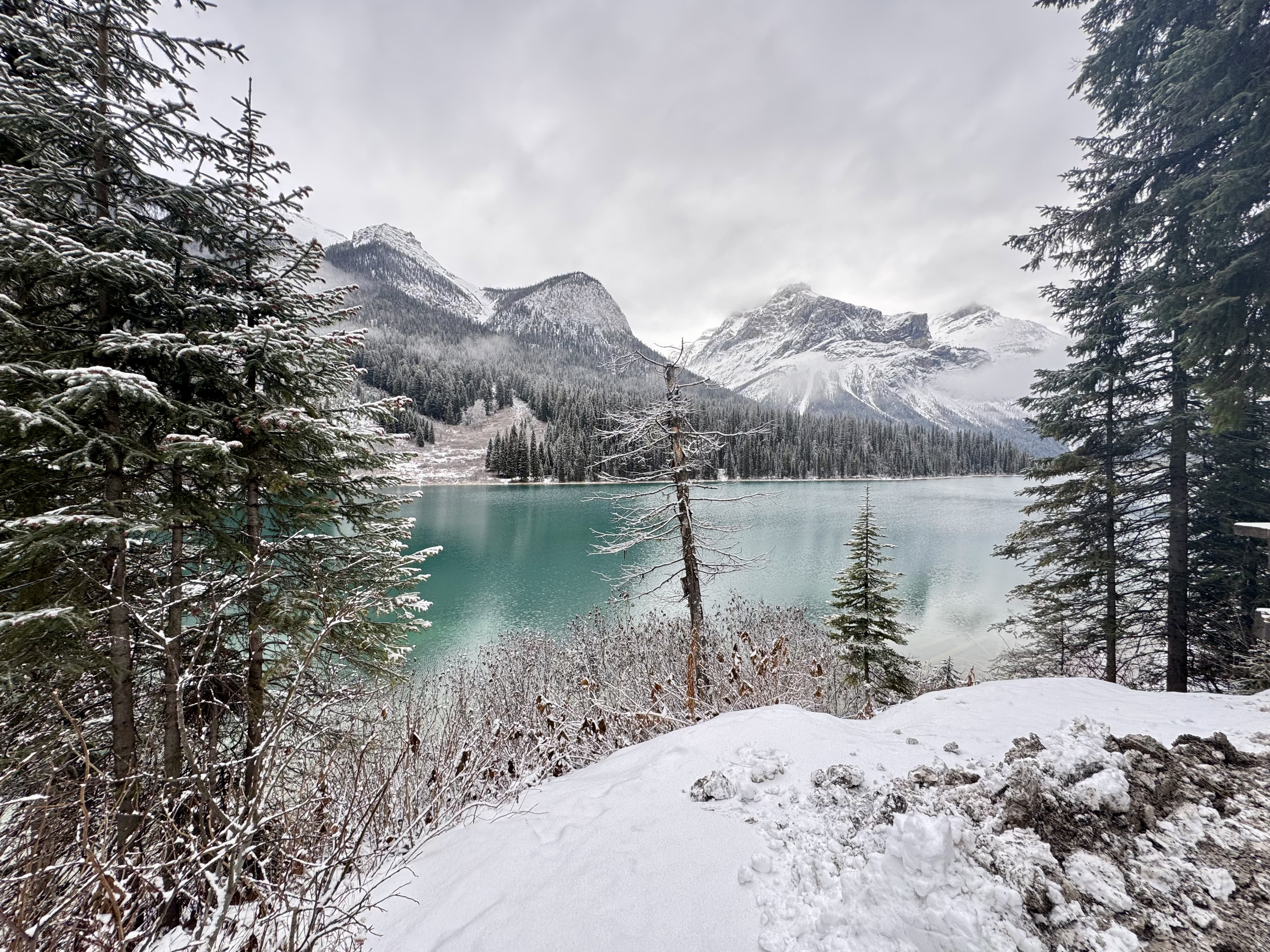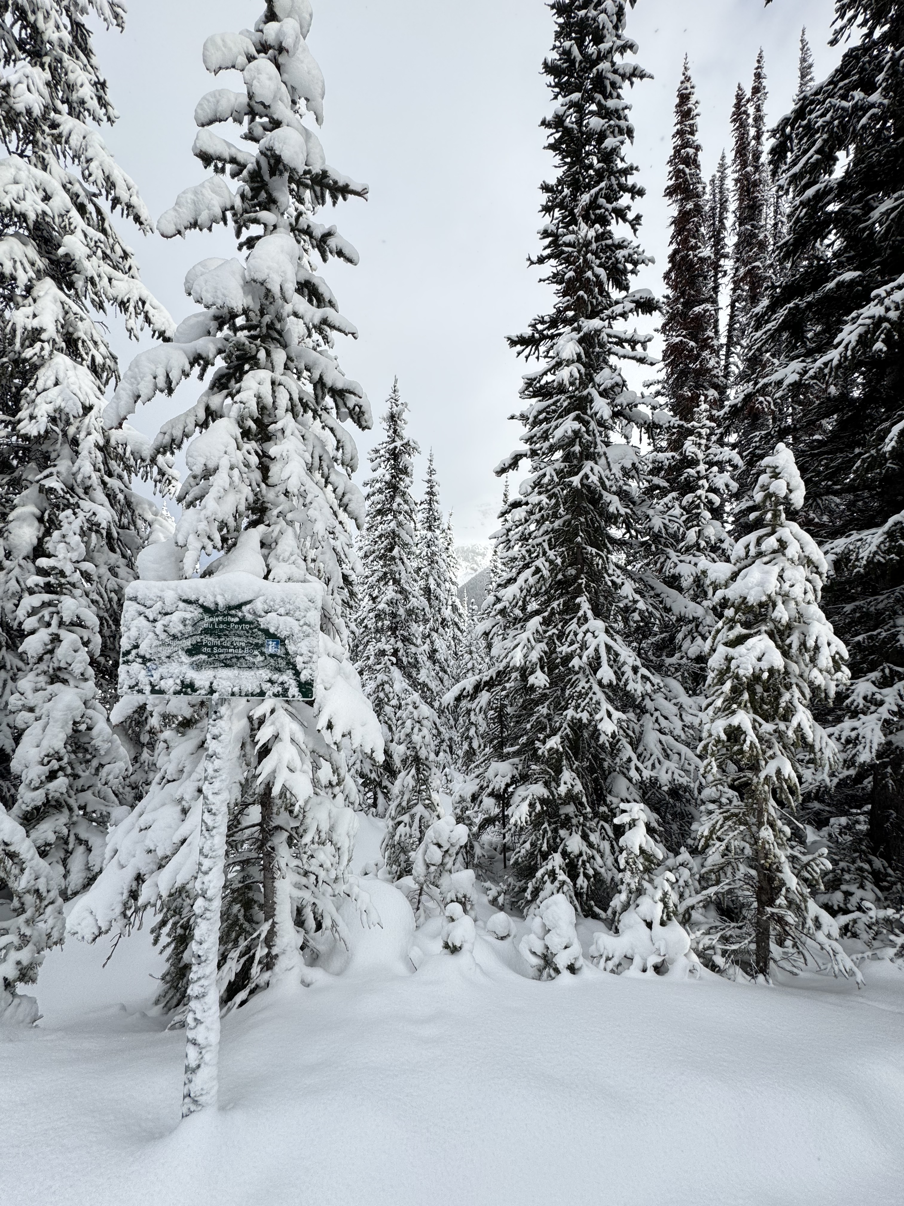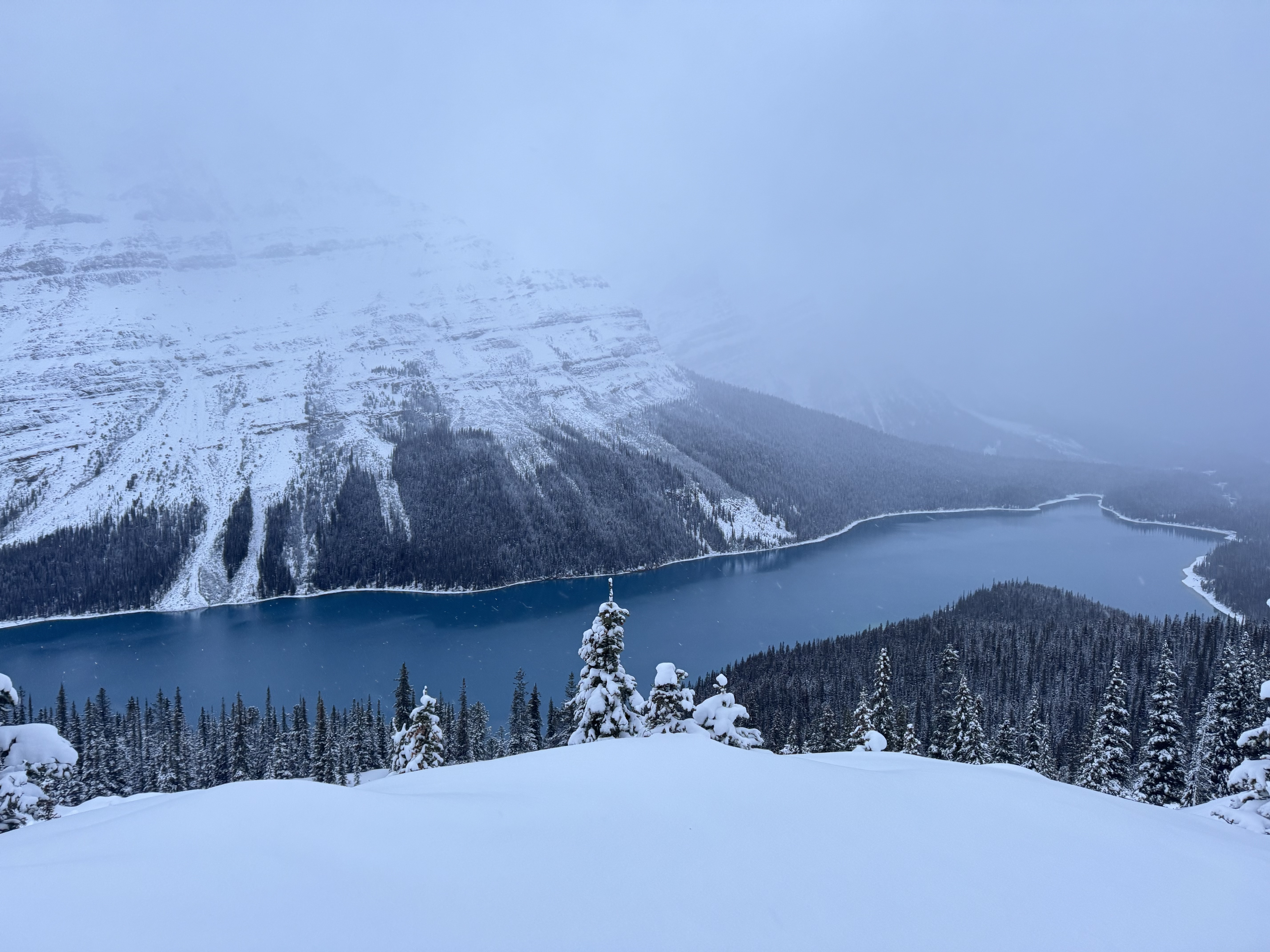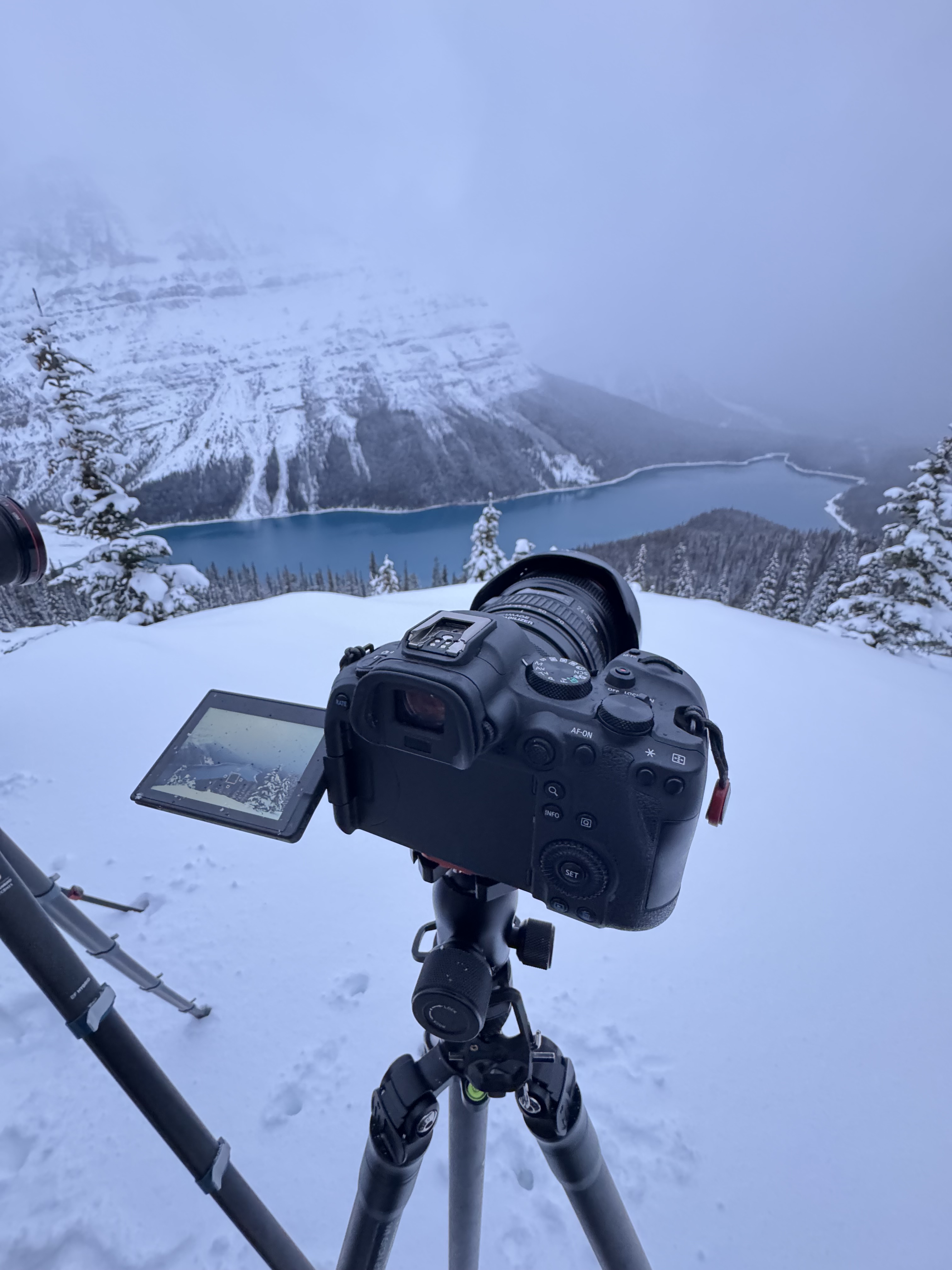 We set out early to shoot a sunrise at Peyto Lake, which is shaped like a fox. Snow fell overnight and our drive out there was harrowing at times. Once we arrived we hiked up to our spot. The fresh snow was deep and it was hard walking up the mountain, especially with all our gear. Once the tripods were set, we waited for sunrise. It was very cloudy again. There was no sun to be found, but we did get some amazing views and shots.