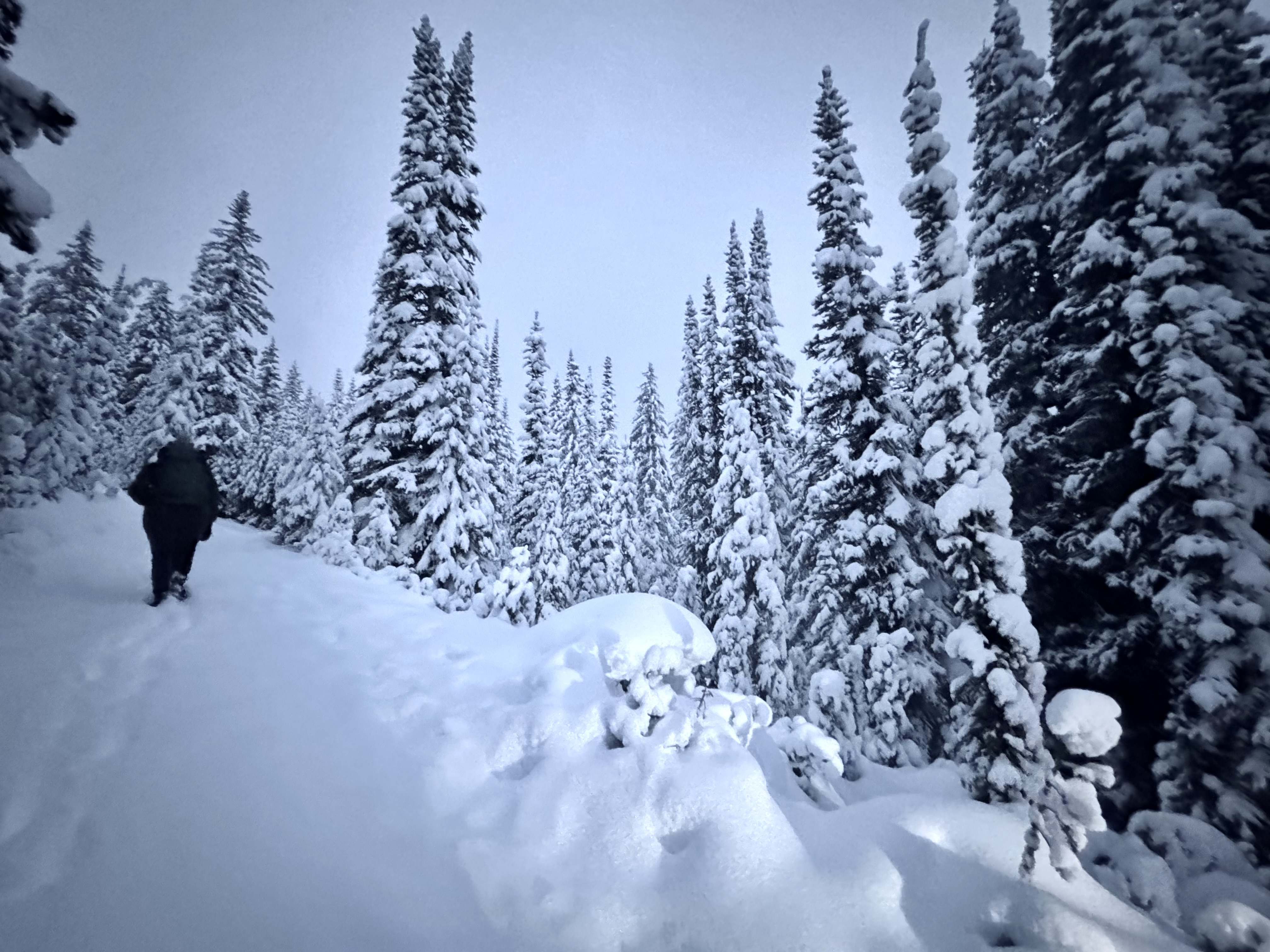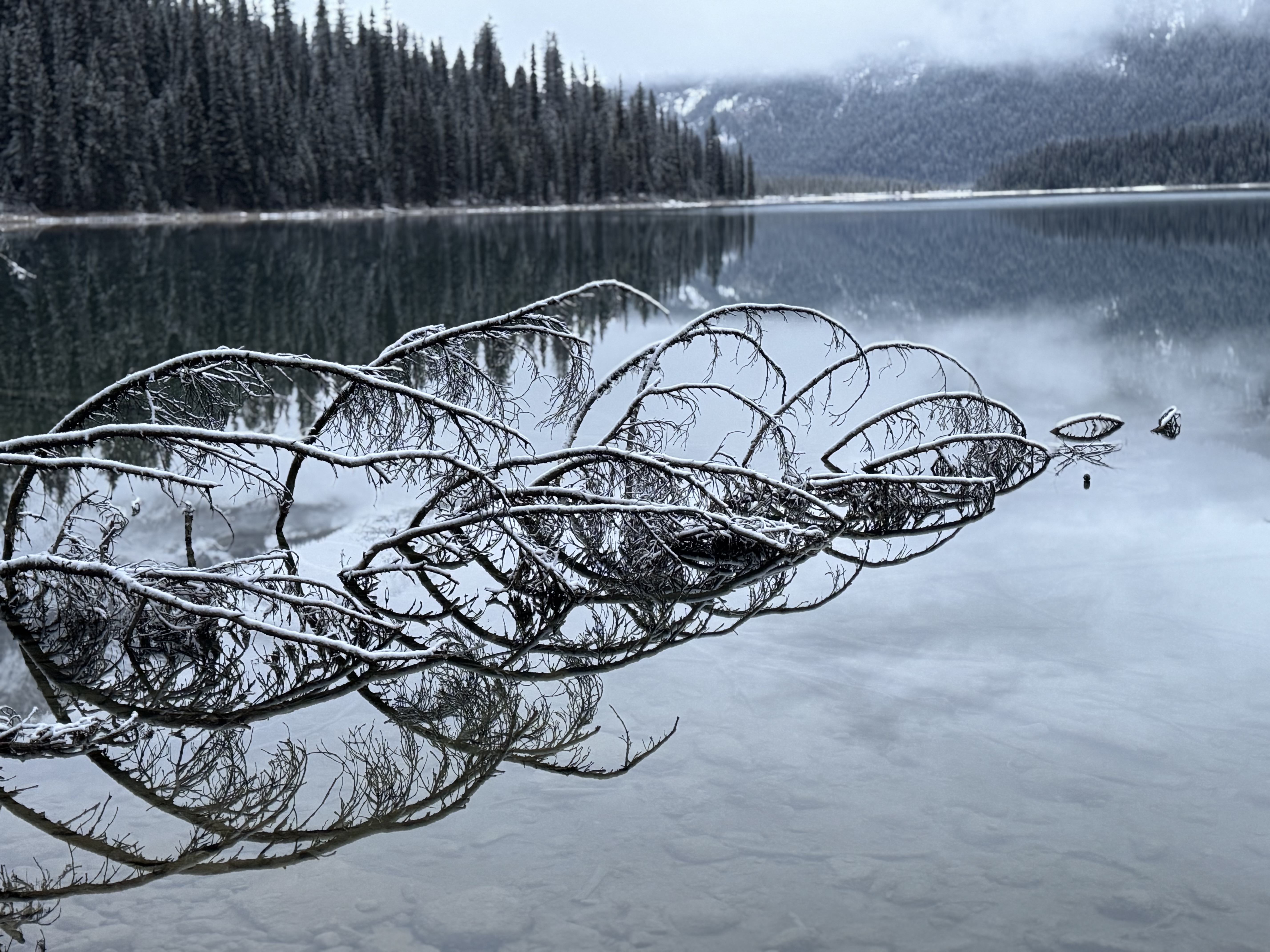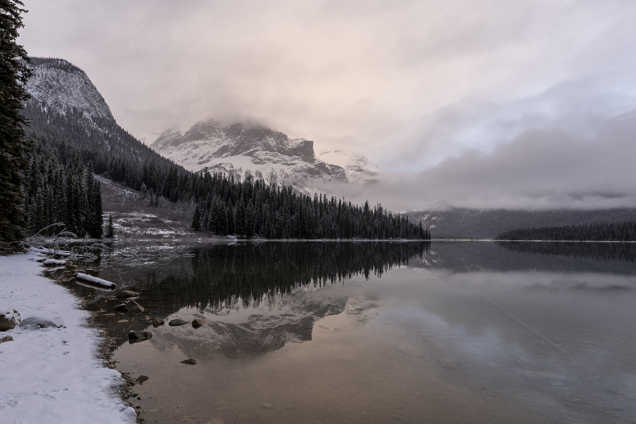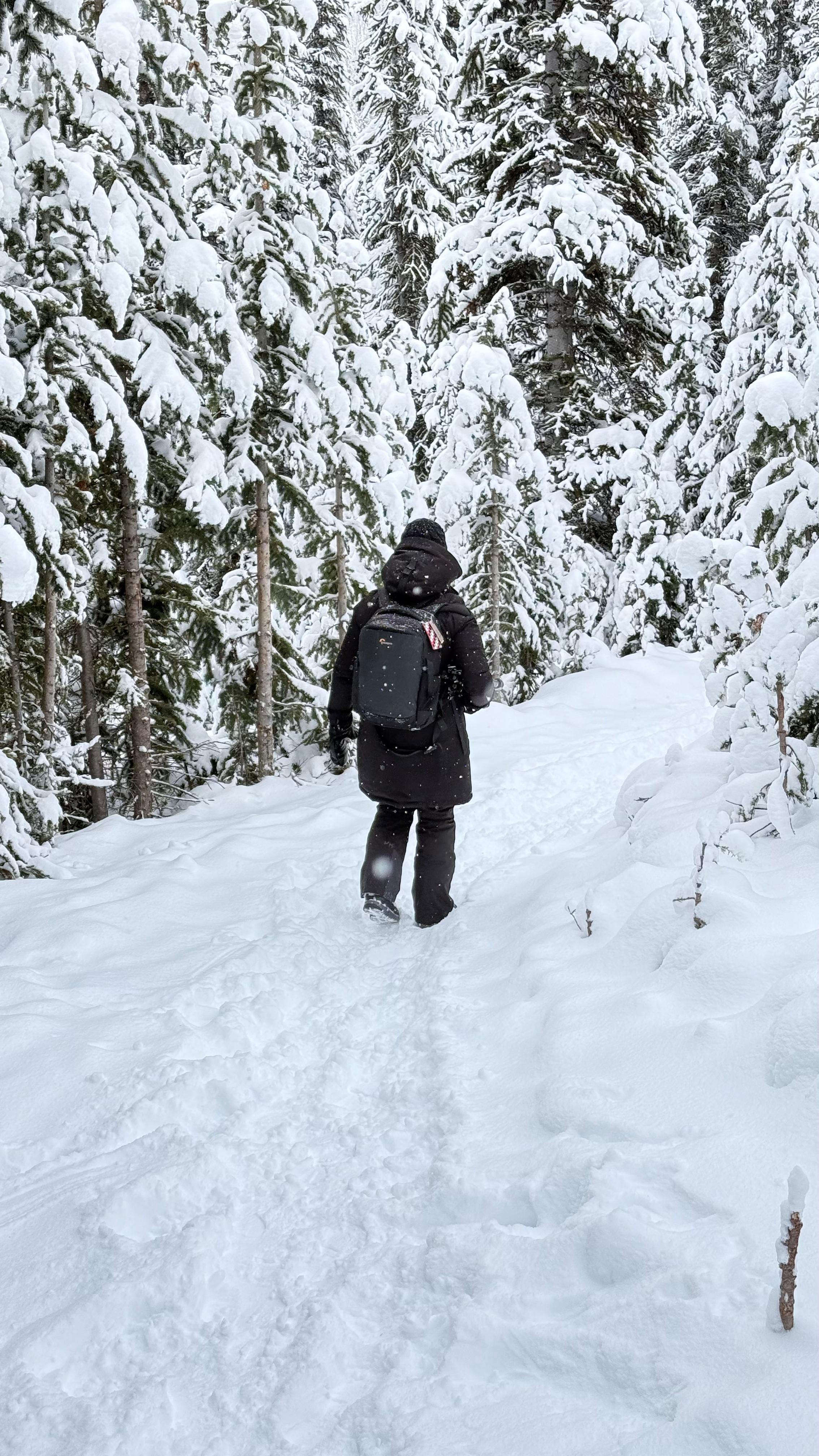 We set out early to shoot a sunrise at Peyto Lake, which is shaped like a fox. Snow fell overnight and our drive out there was harrowing at times. Once we arrived we hiked up to our spot. The fresh snow was deep and it was hard walking up the mountain, especially with all our gear. Once the tripods were set, we waited for sunrise. It was very cloudy again. There was no sun to be found, but we did get some amazing views and shots.
