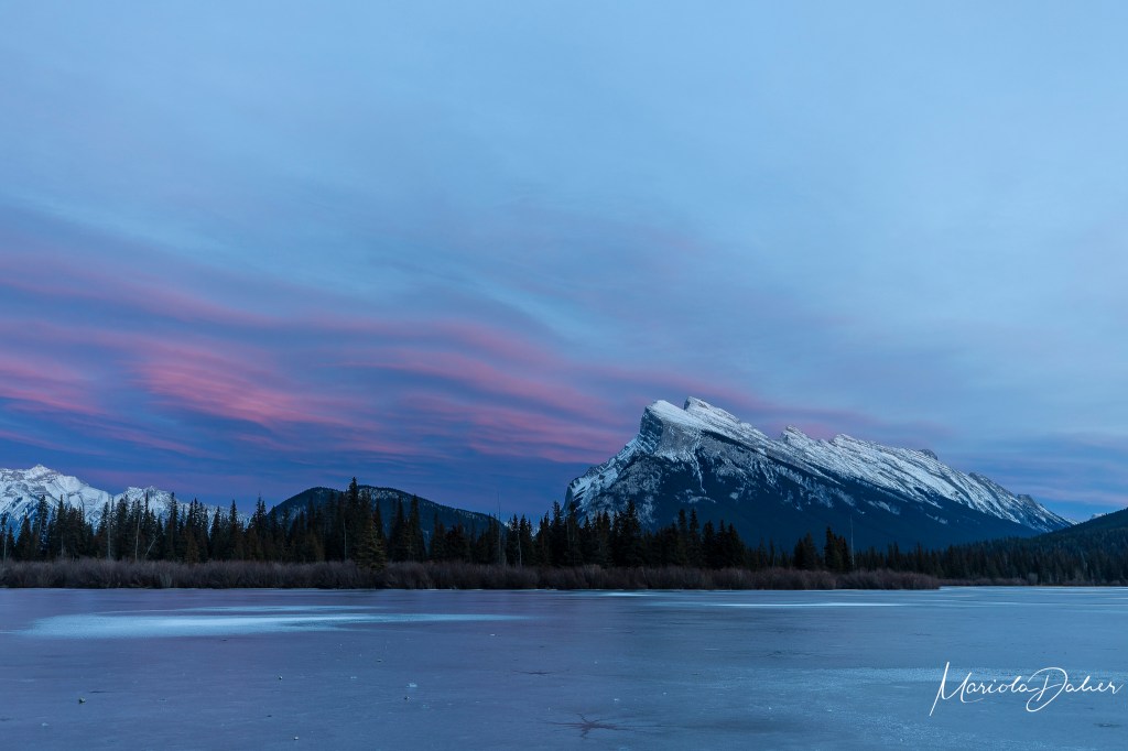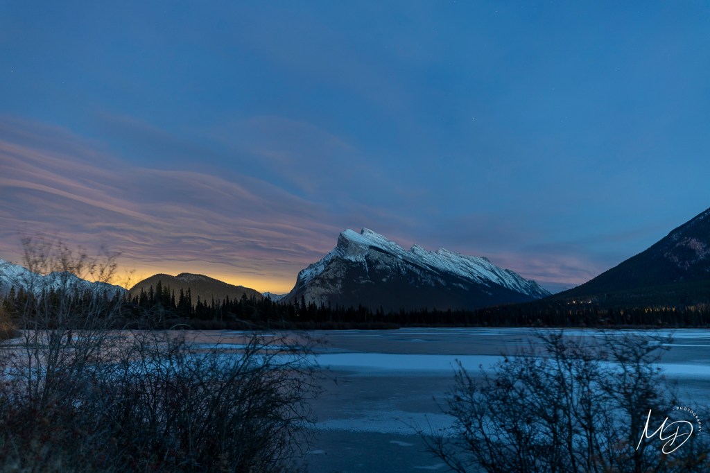 After breakfast I went to the lobby to meet the group and wait for Rachael to pick us up, with her was fellow pro photographers and our teachers for the week world-renowned photographer, Dr. Kah-Wai Lin and Bryan Peters. We stopped in Canmore to do grocery shopping and had lunch at the Blake Restaurant. This was a great way to meet everyone in the group, there were nine of us. We arrived in Banff and settled into our hotel – Brewster and Mountain Lodge. As we waited for our rooms we gathered in the meeting room and went over our itinerary for the week. Our first session was a sunset at Vermillion Lake #2. We arrived early and photographed blue hour and were quite surprised when we realized that we had photographed a Chinook sunset. After a few hours we went to dinner at Shoku Izakaya which is a “Japanese Pub serving traditional and modern fare as well as offerings from other Asian destinations.” The food was delicious.