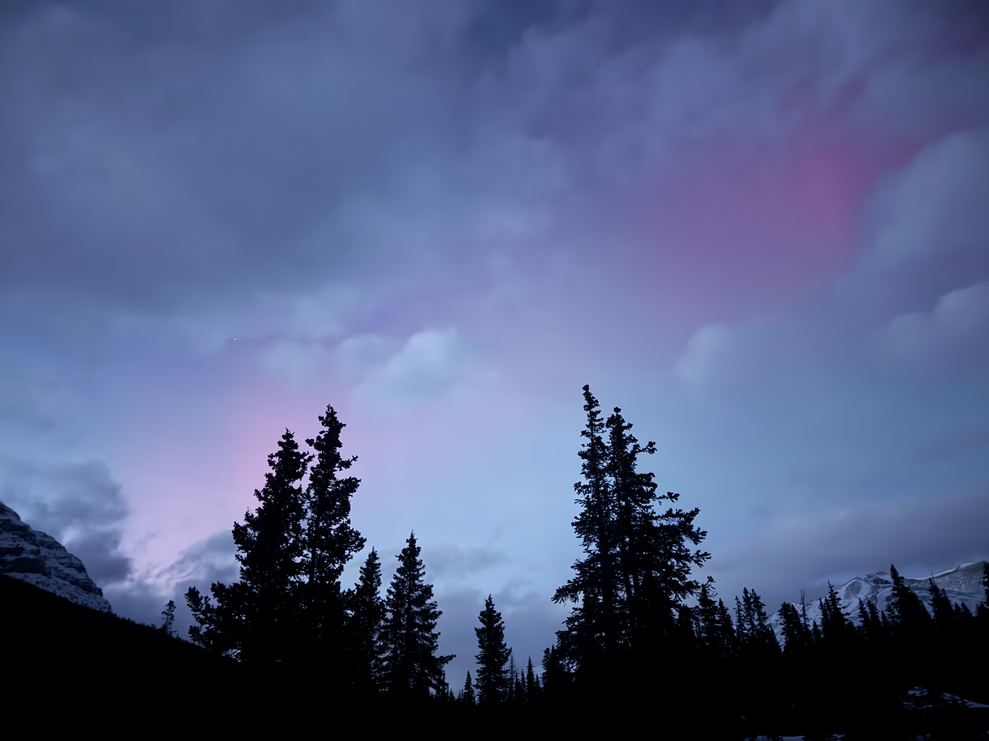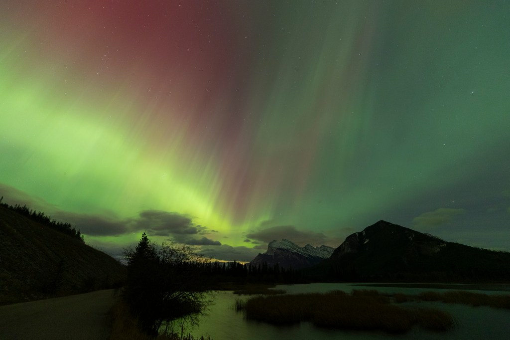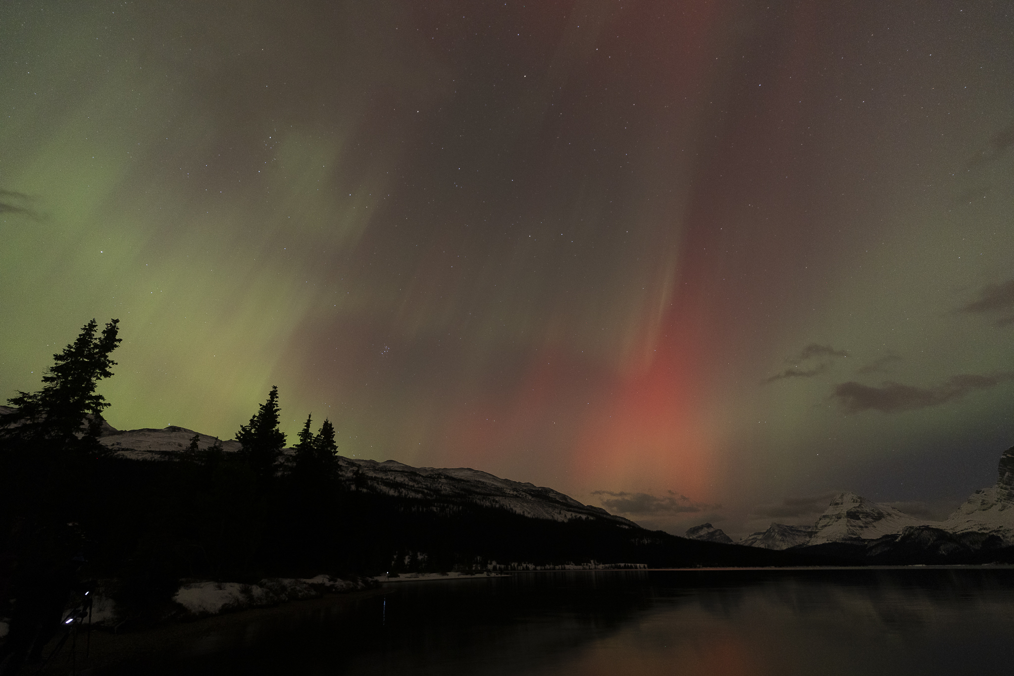 After some breakfast, we headed to Morrant’s Curve. It is a scenic viewpoint near Lake Louise. There is a dramatic bend along the Bow River where trains pass through the Canadian Rockies heading eastward. This famous photo spot is along the Bow Valley Parkway. There is no train schedule for security reasons. Trains pass every hour or two during the day. Everyone just sets up cameras and waits. We arrived there and were fortunate. There was a dusting of snow on the ground. We photographed the train very shortly after our arrival. We had lunch on our own and then met up again for a sunset shoot at Lake Minnewanka. An incredible night of shooting stars and mountains. Rachael was watching the Aurora forecast. The preliminary forecast called for a high Kp index the next few days. We had our fingers crossed that we had clear skies. We headed back and agreed that we would skip sunrise in hopes of a late night of shooting the Aurora.
