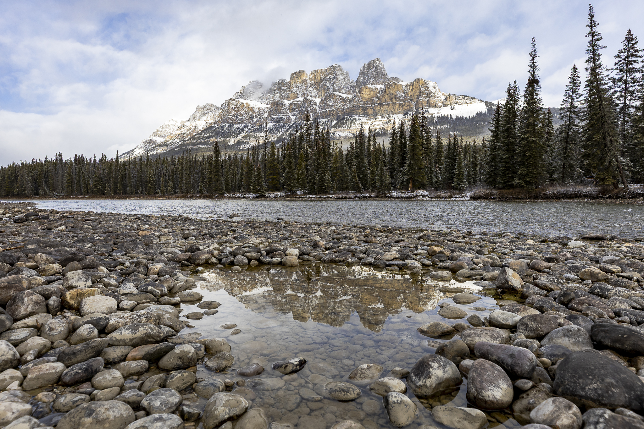 Such a picturesque spot. We had breakfast in the lodge restaurant where there was wi-fi, as there is no cell service in the area. I got a message from my son. He was asking if I was ok because my location showed I was in a lake 😂😂. I thought this was so funny. I let him know I was fine and not in a lake but having the best breakfast ever!! At least one of my kids was checking in on me. 😂 On our way back to Banff, we stopped at Castle Cliffs on the Bow River. This was for a final shoot. I used one of the techniques I learned. I got down low with my tripod and used a small body of water. This created a reflection of the mountain in my shot.