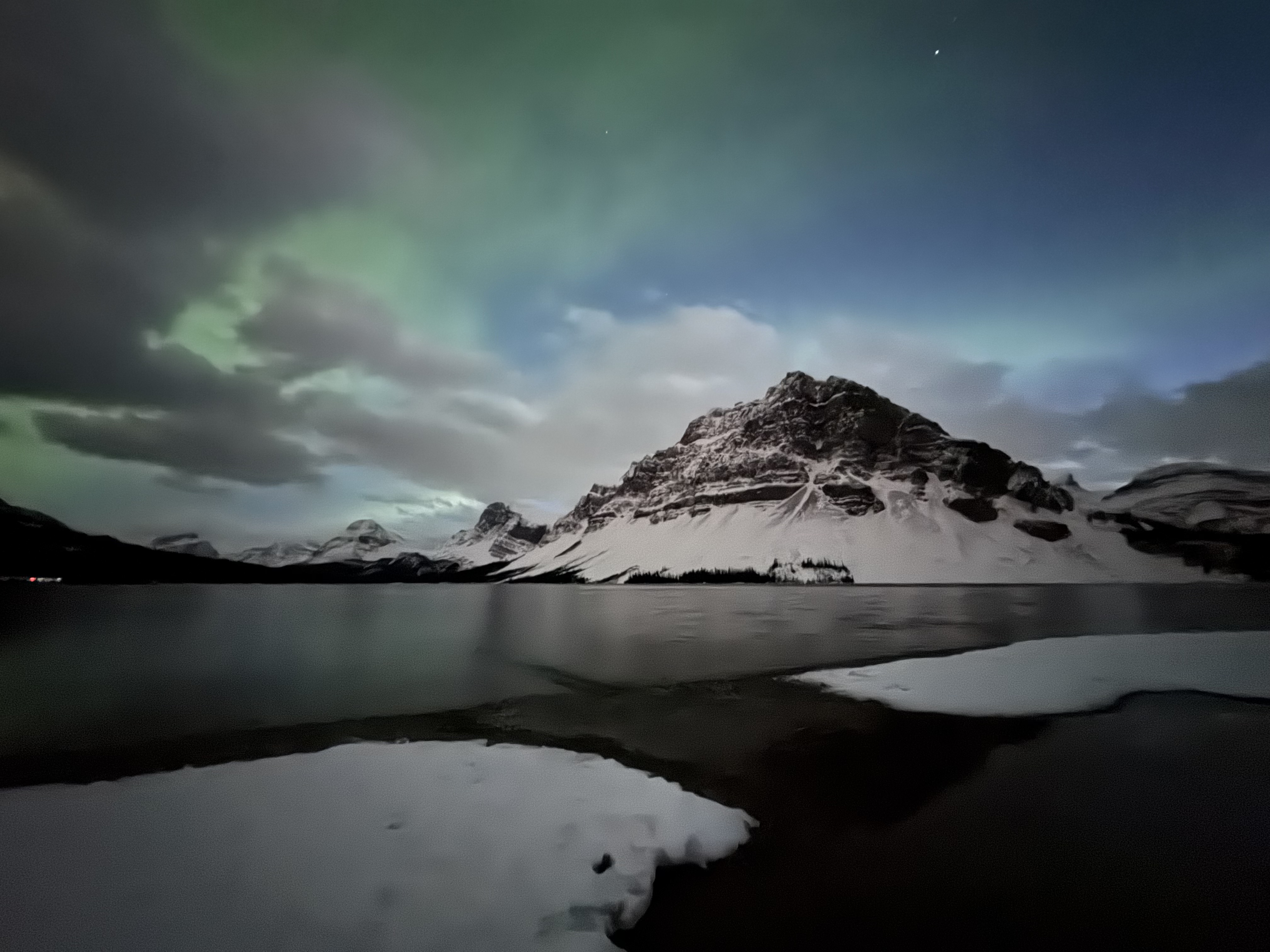 After lunch we headed to Bow Lake for a sunset/ Aurora shoot. I moved around to find my spot. We waited for the sunset and got some great shots. Then, as blue hour started, we see a faint red/green aurora starting. As the sky got darker we saw the lady Aurora make her appearance !! What an incredible sight. We usually look north to see the magic happen. This time, it was 360 degrees. We saw Aurora all around us !! I was speechless and took in the magical night start to unfold. We kept seeing corona after corona. It was crazy. Seeing the Aurora with the Rocky Mountains as the backdrop was a dream come true. After a few hours photographing the Aurora and freezing, I went to the van to eat my dinner. After warming up, I went back out. The clouds stared to roll in and it was getting late.